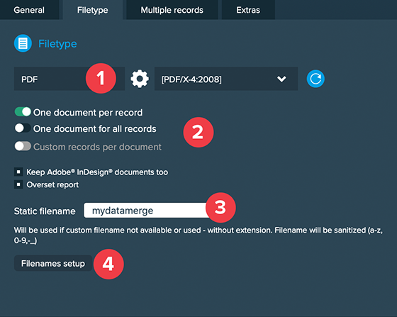 If you did not select custom filenames you can specify a static filename like „mydatamerge“ (default). MyDataMerge will then add a sequential number to each created file.