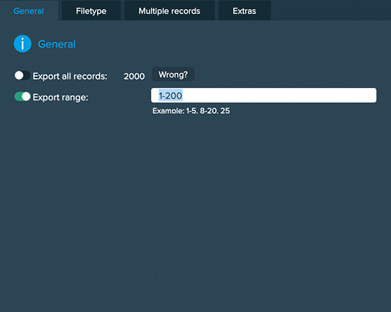This will export all records like mentioned. If you imported a Microsoft® Excel® file, sometimes it happens that MyDataMerge interprets fields with spaces as a data record. You can adjust the correct number in the import settings.