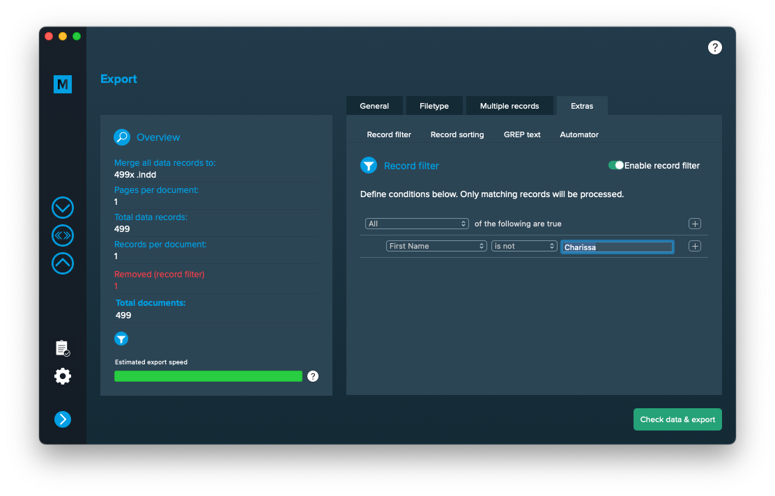 With CSV selected in Export > Filetype, MyDataMerge will export a Adobe® Indesign®’s data merge compatible CSV file. Use this option if you don’t want to merge with MyDataMerge but want to use MyDataMerges ability to customise the data.