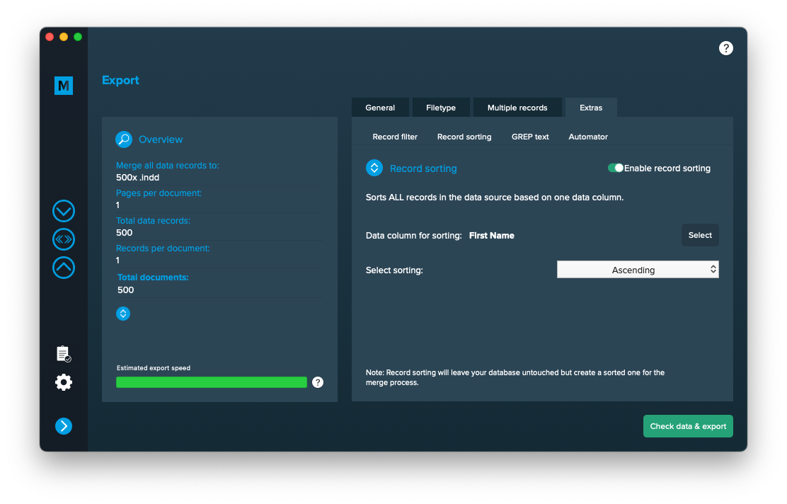 Go to Export > Extras > Record sorting and select the data column to sort records after. Currently theres no multi-sort possible. You may then also choose to sort the records ascending or descending. This will not change the datasource itself but provide a sorted datasource to the merge process.