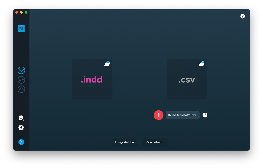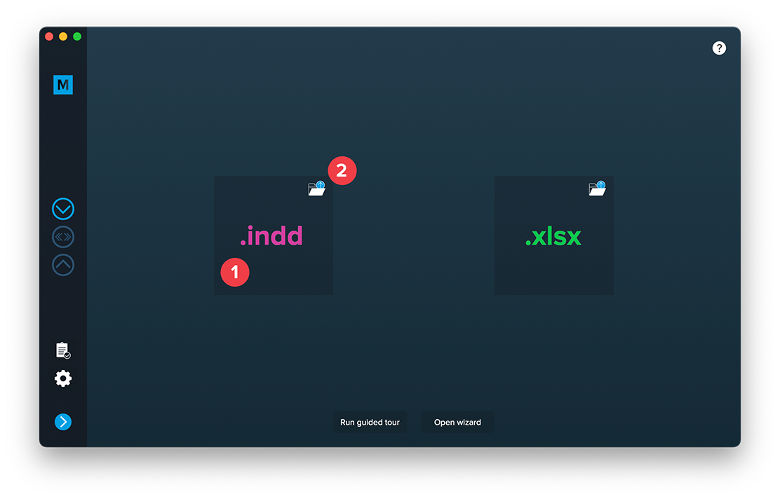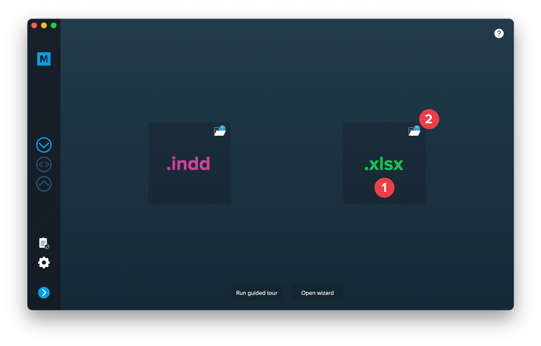 Open MyDataMerge, start a new project and drag and drop your .indd file on the INDD area [1] or select the file by clicking the folder button [2]
