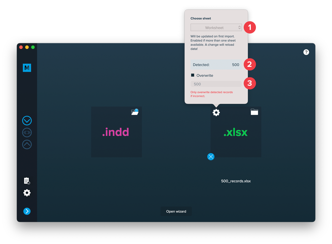 Here you can select the worksheet from which to import the data from [1]. MyDataMerge tries to detect the amount of records by scanning the file. Sometimes – even if cells look empty – they might contain space characters which causes the resulting amount of records [2] to be incorrect. Then (and only then) you can overwrite the total amount of records to import [3]. Note: The first row (with column labels) is NOT taken into account so record 1 starts in Excels row 2.