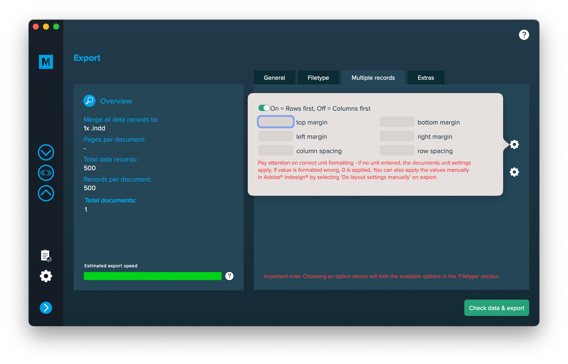 Note: This feature uses InDesigns standard behaviour when handling multiple records per page. It still has limitations and some recorded bugs (on Adobe’s side). We recommend using multiple merge with existing layout.