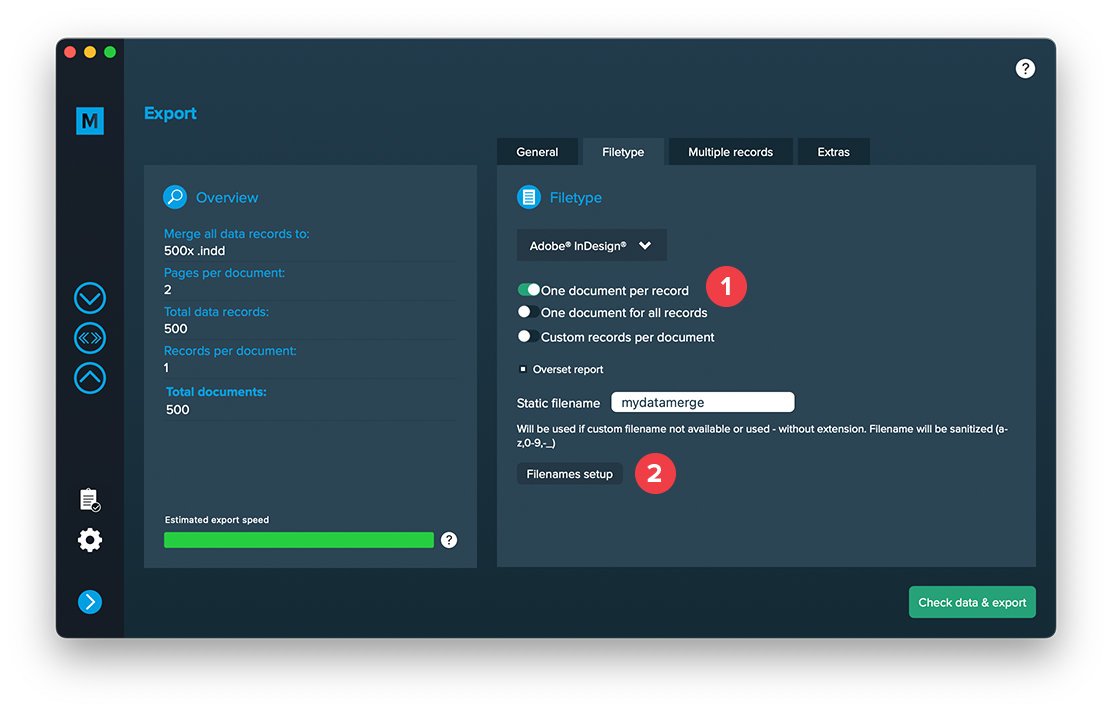 To configure dynamic file names go to Export > Filetype and make sure “One document per record” [1] is activated. Then a button “Filenames setup” [2] appears. Click it to configure your filenames.