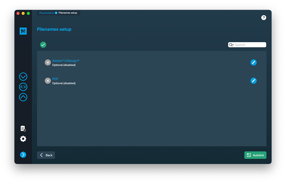 If you click the “Filenames setup” button you can then select the filetype to setup custom naming. If you e. g. export to PDF files and keep a copy of your InDesign files you can define both the names for the PDF files and the InDesign files. Double click a row and enable it. Then you can configure it like a placeholder.