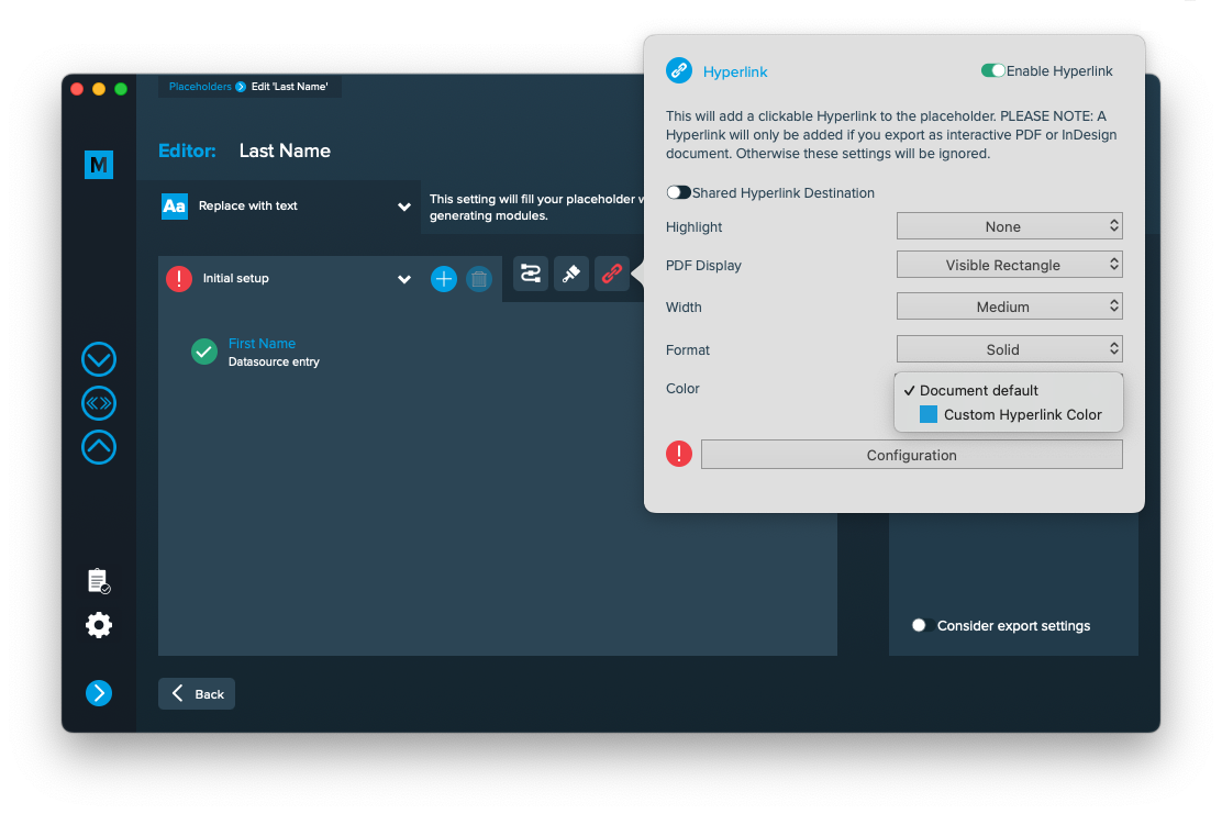 You can add Hyperlinks dynamically to your placeholders, no matter if its a text, image or QR-Code placeholder. After applying hyperlinks, a reader can click on the element to open the hyperlink.
