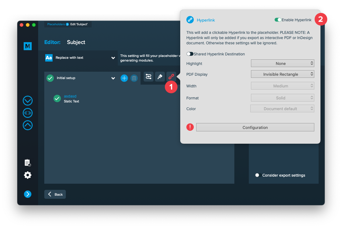 Hyperlinks are part of a setup – this gives you the full advantage of a setups flexibility (e.g. to apply different hyperlinks to the same placeholder based on conditions). To add a hyperlink, open the placeholder in the editor and click the hyperlink icon [1] to open the hyperlink panel. Then enable the hyperlink [2] and start with your configuration:
