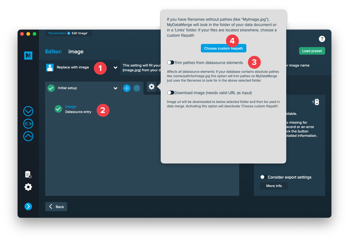 - Open the settings (gear icon) and activate “Trim pathes from datasource elements” [3]. This will make “/path/to/your/image.pg” to “image.jpg”