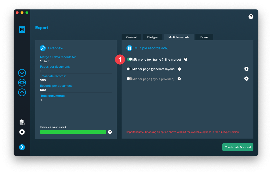 Go to Export > Multiple Records and activate “MR in one text frame (inline merge)” [1]. If you cannot select it, please check again if your layout meets the requirements (in step “Setup layout for inline merge”).